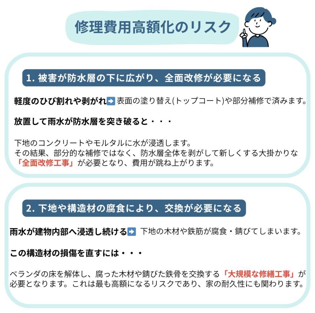 防水層の劣化を放置してしまうと、修繕費用が数倍に膨らむ可能性があります。