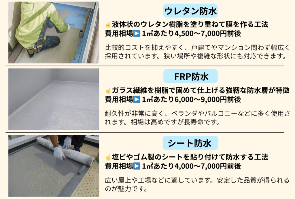 防水工事と一口に言っても、使用する工法によって費用相場は大きく変わります。主な3種類の防水工事と、それぞれの特徴・単価の目安を見てみましょう。